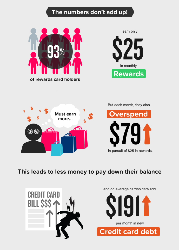 While non-rewards credit cards entice you to spend more than you have, rewards cards further tempt you by backhandedly rewarding you for putting yourself in debt, therefore increasing interest payments.