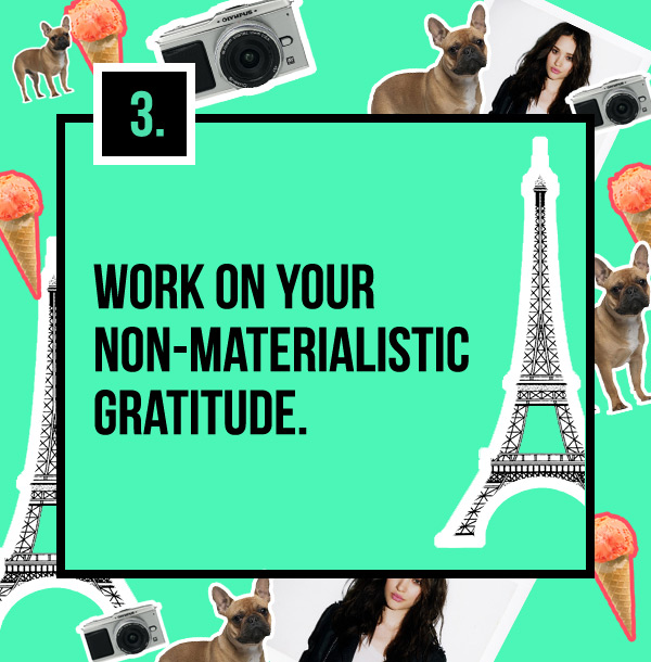 Make another list, this time of non-material things that you can be grateful for, like your bae, Chico your French Bulldog, or your upcoming trip to Europe, for example.