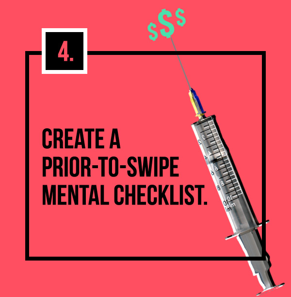 Knowing that this purchase high won’t last long after you exit the store, develop a prior-to-swipe mental checklist that will help you make the right decision. Ask yourself a few questions: Is this a spur-of-the-moment purchase? Is this a credit card swipe inspired by a pure want? Will this end up in my crap pile?