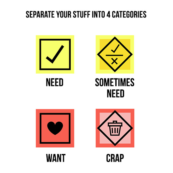 Keep the needs, get rip of the crap, and revisit the sometimes need and want categories, asking yourself a few simple questions before promoting them to need or demoting them to crap (and subsequently throwing them out): when was the last time I wore/used this? Will I really ever wear/use it again? Is this random item good for anything?