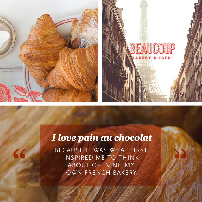 I love the pain au chocolat (chocolate croissant) because it was what first inspired me to think about opening my own French bakery. I had one every morning when I was in Paris and missed it so much that I started making them back in Vancouver. I tested 60 different doughs until I found the right one!