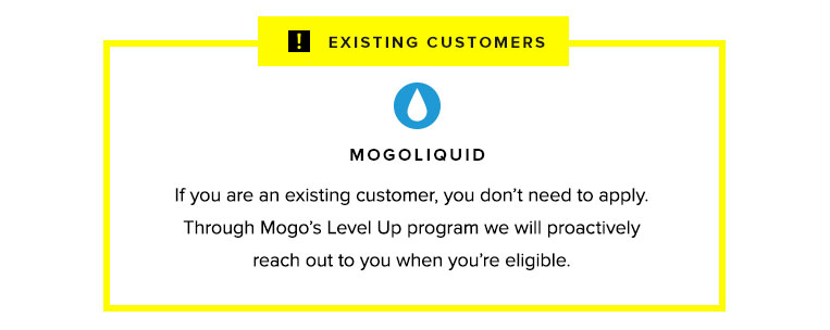 •If you are an existing customer, we will pro-actively identify whether you are eligible for MogoLiquid through our Level Up program and will contact you should that be the case.