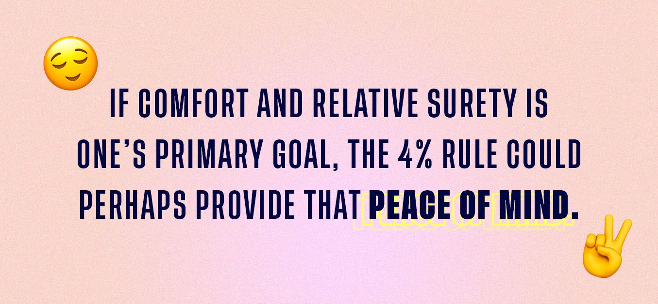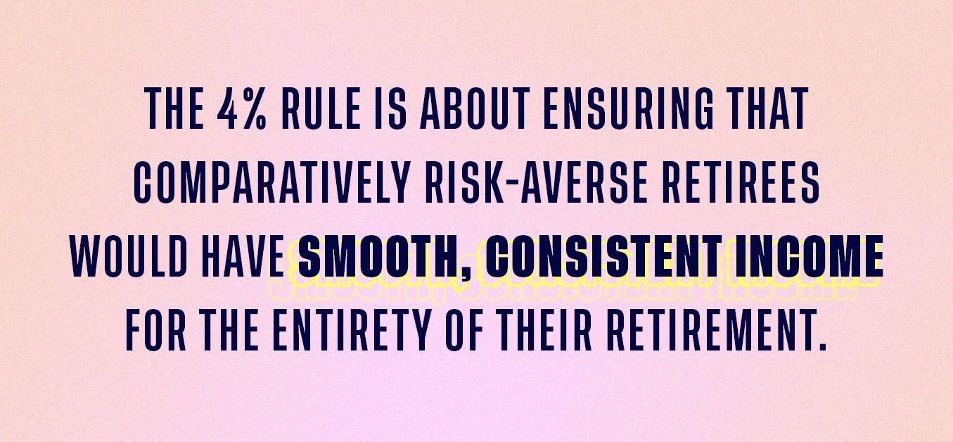 The 4% Rule is about creating a constant income for the entirety of the retirement, and is intended to create peace of mind for retirees that they’ll be supported through their old age. So basically, at a retirement age of 65, one would earn the same annually as they would at age 90.